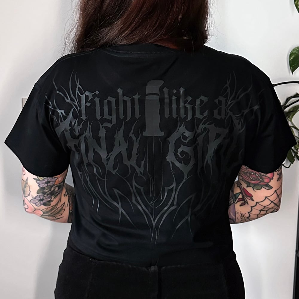 ✨🖤🔪Fight Like A Final Girl in Black🔪🖤✨ relaxed fit black crop top. Printed front and back in dark grey.
